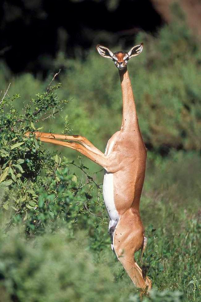 Gerenuk comes from the Somali language and means “giraffe-necked.” To feed from taller branches, gerenuks will stand on their hind legs.